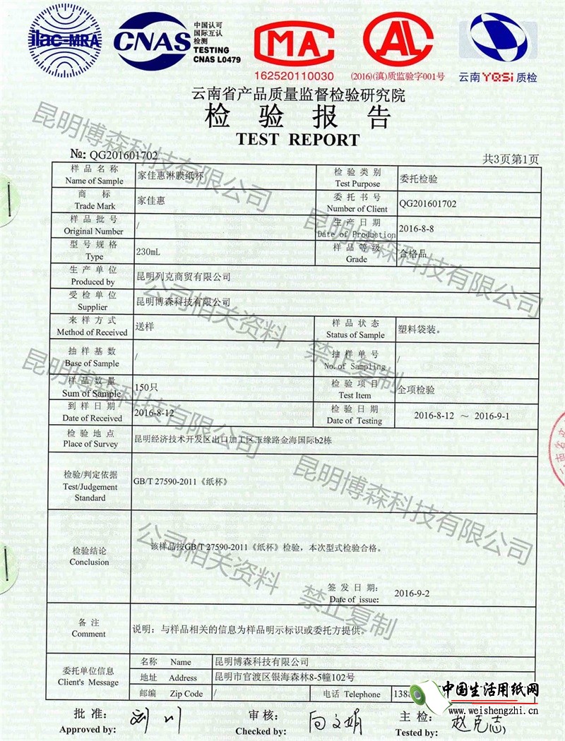 證書(shū)介紹 王子環(huán)保生活紙杯質(zhì)檢報(bào)告,按照標(biāo)準(zhǔn)項(xiàng)目,所有指標(biāo)全檢,并全部合格!