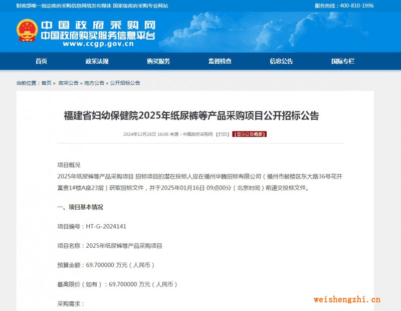 2025年紙尿褲等產品采購項目 招標項目的潛在投標人應在福州華騰招標有限公司(福州市鼓樓區東大路36號花開富貴1#樓A座23層)獲取招標文件,并于2025年01月16日 09點00分(北京時間)前遞交投標文件。