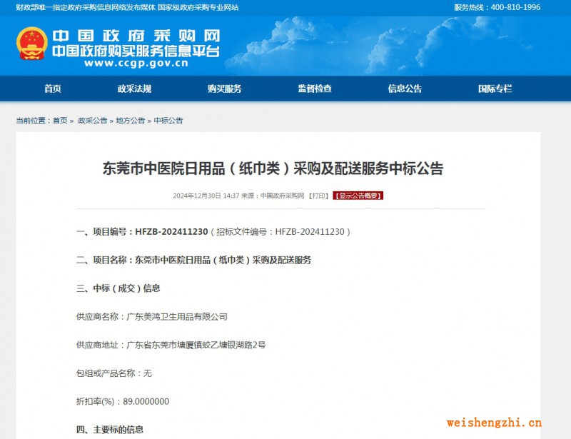 | 1 | 廣東美鴻衛生用品有限公司 | 東莞市中醫院日用品(紙巾類)采購及配送服務 | 按招標文件要求 | 按招標文件要求 | 按招標文件要求 | 按招標文件要求 |