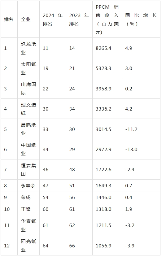 前一年增速最快的太陽紙業(yè)在2024年依舊實現(xiàn)了增長,盡管增速下降,但排名上升到第19位,首次進入全球前20強。