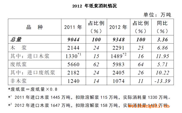2012年我國紙漿消耗量中木漿的消耗量較2011年增長1%,其中進口木漿的消耗量增長1%,而非木漿的消耗量從2011年的14%下降至11%。