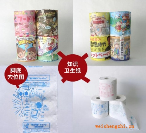 知識性衛生紙:如題,衛生紙上印有多種知識點,英語教學,地震防災,腳底按摩穴位等等,值得向學校和全社會推廣的帶有一定公益性的趣味用品。