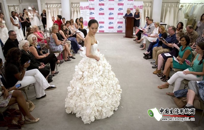 當地時間2015年6月17日,美國紐約,當地的Kleinfled婚紗店舉辦一年一度的“衛生紙婚紗”大賽。該次比賽為第十一屆,參賽者只能用衛生紙、膠水、膠帶還有針進行制作,獲勝者將獲得1萬美元的現金獎勵。