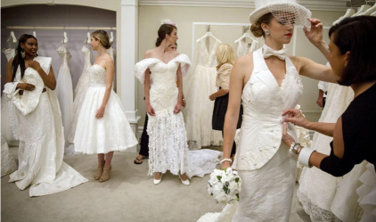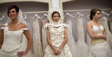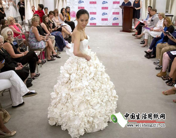 精心折疊、粘貼而成的衛生紙婚紗。時尚前衛的設計,裙擺以花邊裝飾,乍看上去,這些婚紗的外觀華美異常,質感就像真正的織品一樣,幾乎跟普通婚紗沒有任何區別。你看見過衛生紙做的婚紗嗎?