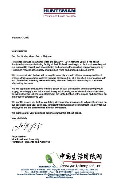 文章大意:亨斯邁芬蘭波里鈦白工廠2月1日發(fā)生不可抗失火事件,由此導致亨斯邁無法合理控制工廠運轉,迫使其無法保障在波里工廠所生產的各類型和級別的產品供應。