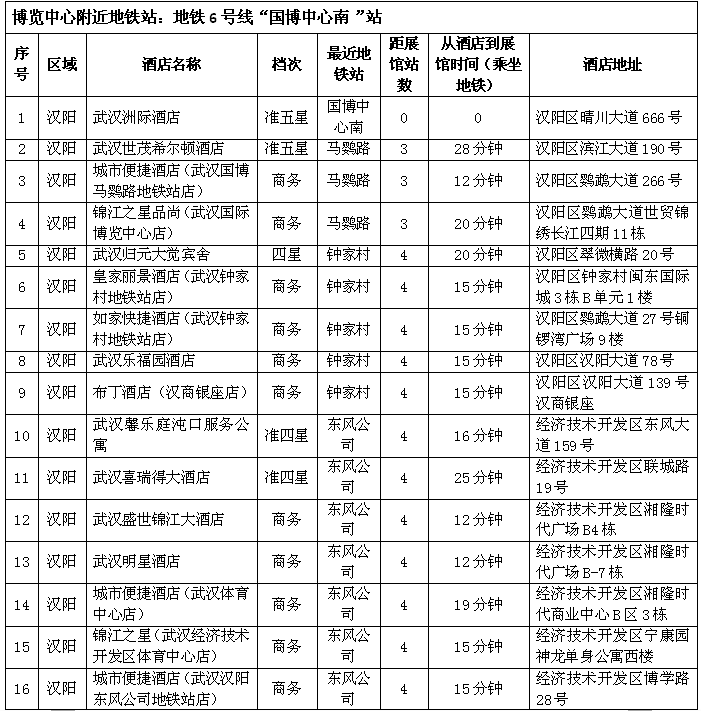鑒于博覽中心周邊酒店、交通等配套設施尚未完善,建議參會人員提前預訂地鐵6號線沿線酒店。博覽中心附近部分酒店名錄如下: