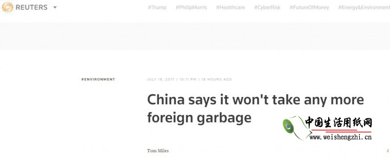 英國路透社7月19日報道稱,中國在送交WTO中的文件表示,一般可回收利用的固體垃圾中,常摻雜有為數(shù)不少的高污染垃圾與危險性廢物,污染中國環(huán)境,為了保護環(huán)境與人民的健康,中國要調(diào)整垃圾進(jìn)口法規(guī),拒收高污染的固體廢棄物。