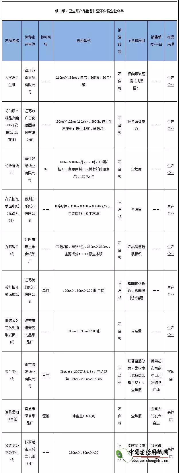 紙巾紙:紙巾紙分為紙面巾、紙餐巾、紙手帕等。本次共抽查65批次紙巾紙,合格55批次,合格率為84.6%。其中抽查江蘇企業產品61批次,合格52批次,合格率為85.2%。