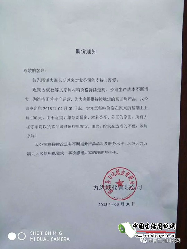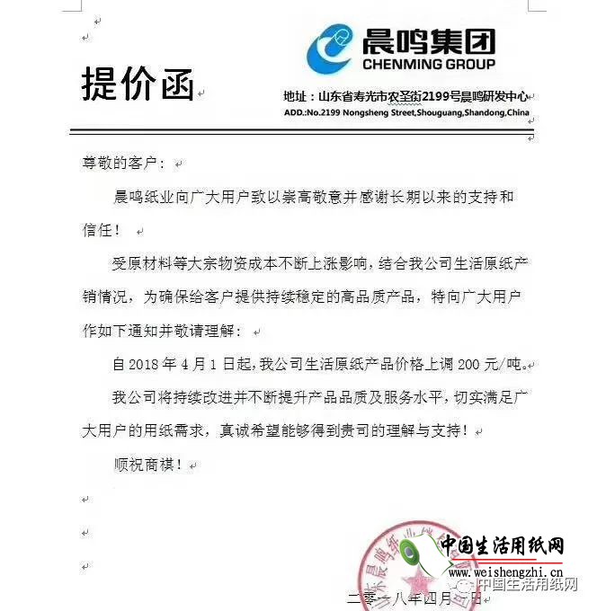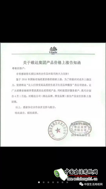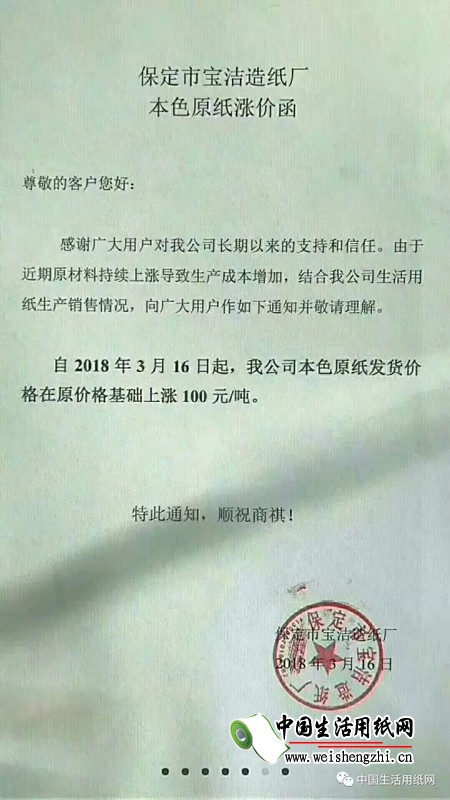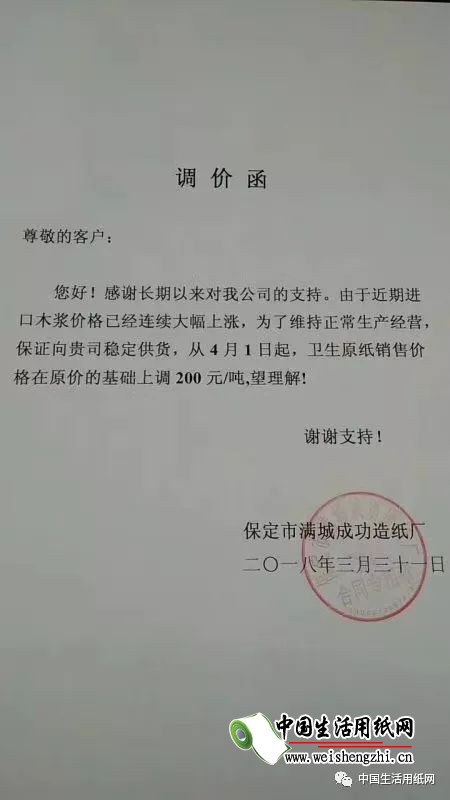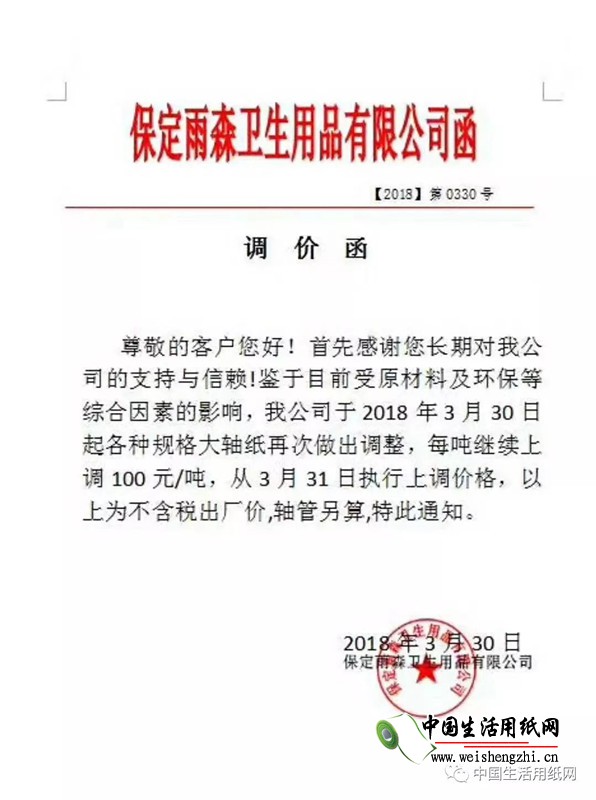 河北華邦衛(wèi)生用品有限公司:由于近期原材料價格上漲,致使生產成本大幅增加,我公司決定自2018年4月1日起生活原軸在原價格基礎上上調100元/噸。