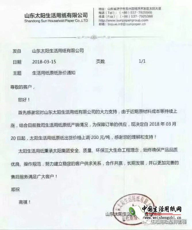 山東太陽生活用紙有限公司:近期原材料成本持續(xù)上漲,結合目前我司生活紙原紙銷售情況,目前決定自2018年3月20日起,太陽生活用紙原紙出貨價上調200元/噸。