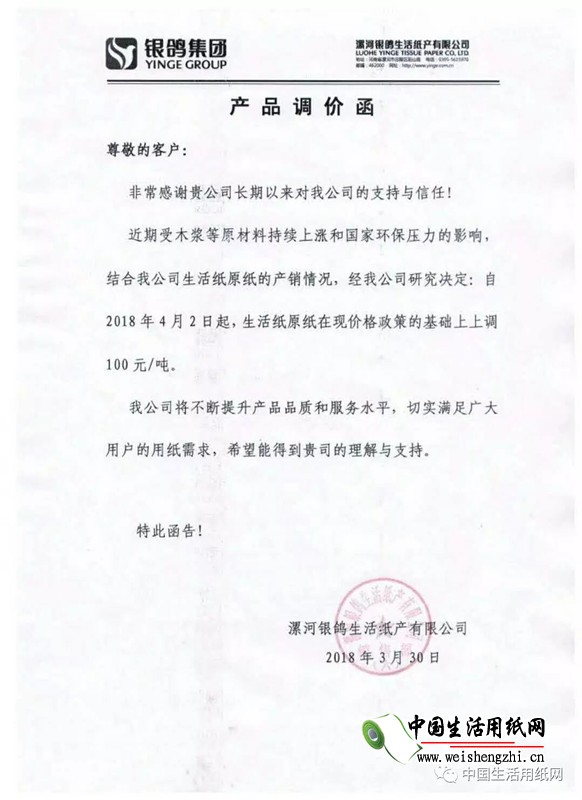 漯河銀鴿生活紙產有限公司:受原材料持續(xù)上漲和環(huán)保壓力,公司研究決定:自2018年4月2日起生活紙原紙在現價格政策基礎上上調100元/噸