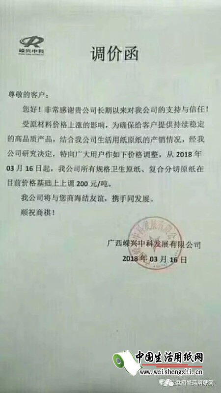 廣西嶸興中科發(fā)展有限公司:受原材料上漲的影響,從2018年3月16日起,我司所有規(guī)格衛(wèi)生紙原紙上調200元/噸。