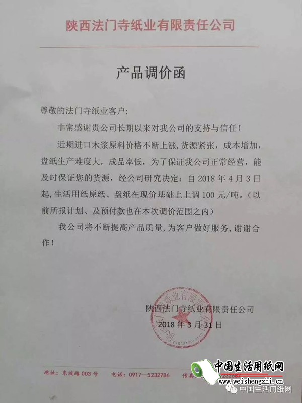 陜西法門寺紙業(yè)有限責任公司:受近期原材料價格不斷上漲,成本增加。為了保證我公司正常運營,經公司研究決定:自2018年4月3日起,生活用紙原紙、盤紙在現價基礎上上調100元/噸。