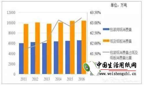 ?2011-2016年包裝紙消費量占紙及紙板消費總量對比