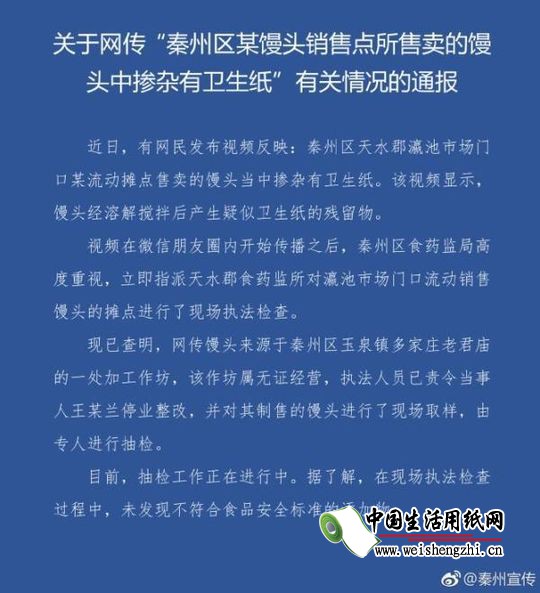 8月8日14:41分,微博名為@武山事兒的網友發出一段“紙饅頭”的視頻,配文稱,有網友爆料:天水郡菜市場門口買的饅頭疑似是用衛生紙做的,并@天水食藥監詢問其是真是假。微博發出過后,立即引發網友熱議。