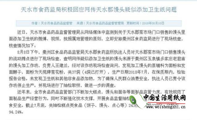 8月10日,記者聯系到了秦州區委宣傳部相關負責人,該負責人表示,目前執法人員已經責令當事人王某蘭停業整改,并對其制售的饅頭進行了現場取樣,由專人進行抽檢。天水市食品藥品監督管理局則表示,檢驗報告合格,并未發現衛生紙和其他非食品添加物。