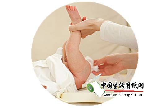 6.拿已經打開的新的紙尿褲輕輕放在寶寶的臀下。注意不能將寶寶的腿抬得過高,不能超過45度,注意紙尿褲的貼條不要粘住寶寶嬌嫩的皮膚。
