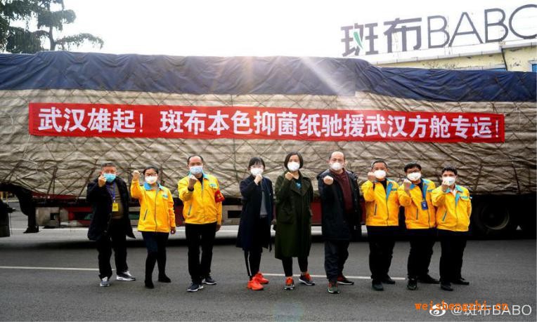 當公司得知武漢方艙醫院大量緊缺生活物資,斑布主動聯系公益慈善基金會,再次組織貨源,于2月11日起,將分兩批次組織車隊定向武漢九家方艙醫院捐 贈斑布本色生活紙 201萬元,為武漢方艙醫護人員及患者提供生活方便。