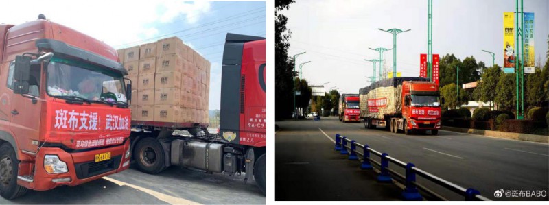 駛向武漢的車隊,每一輛貨車上的紅色標語,滿載著每一個斑布人的祝福! “斑布支援,武漢加油”、“英雄城市武漢,斑布等你凱旋歸來“!