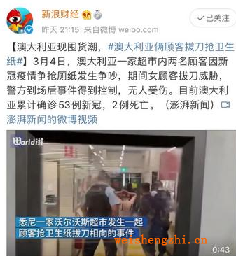 有報道稱,澳大利亞兩位居民為了搶衛生紙,甚至拔刀相向。