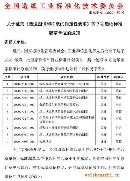 關于征集《普通圖像印刷紙的穩定性要求》等9項造紙標準起草單位的通知